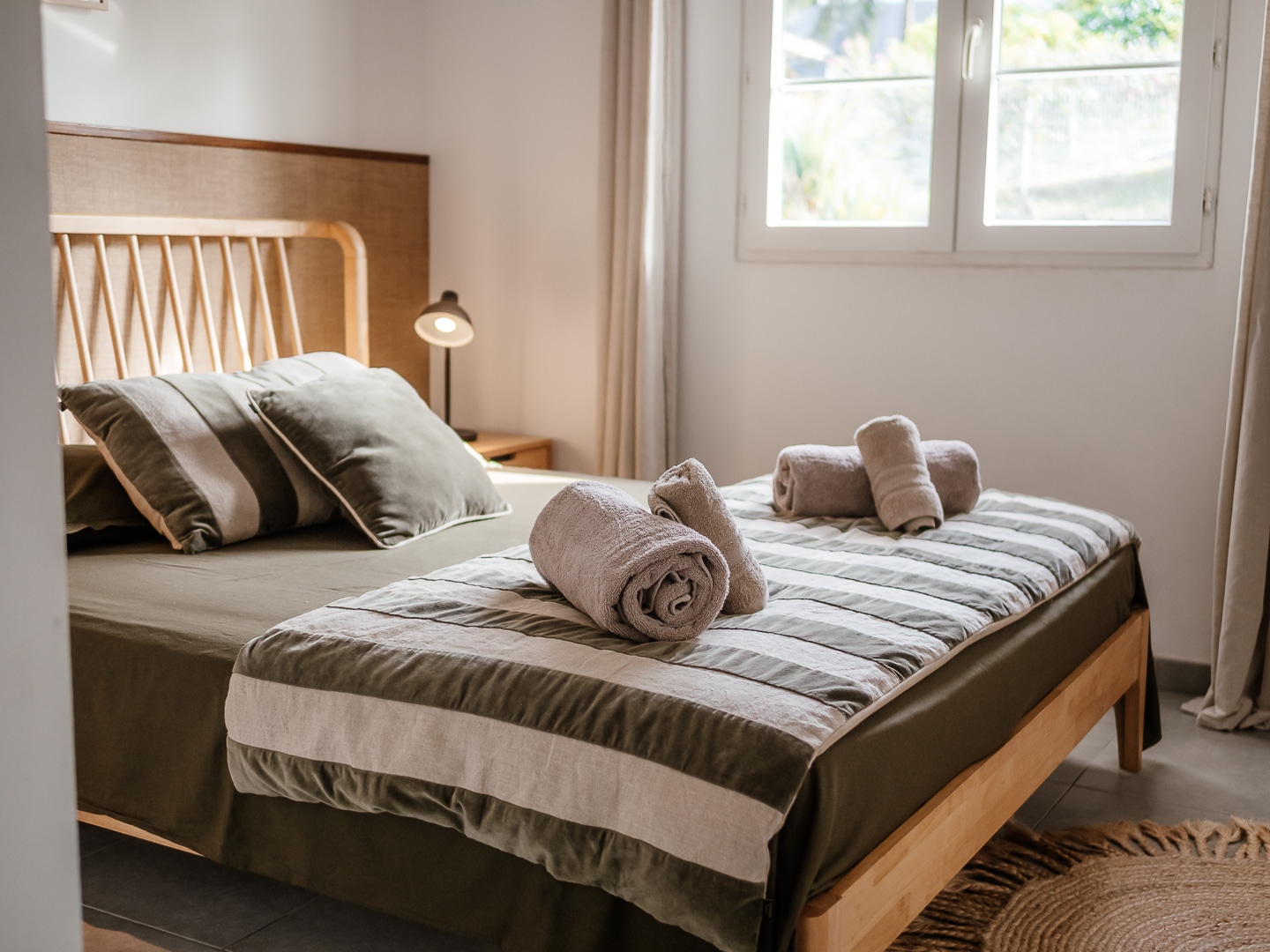 - Linge de lit et serviettes regroupés et déposés au pied du lit